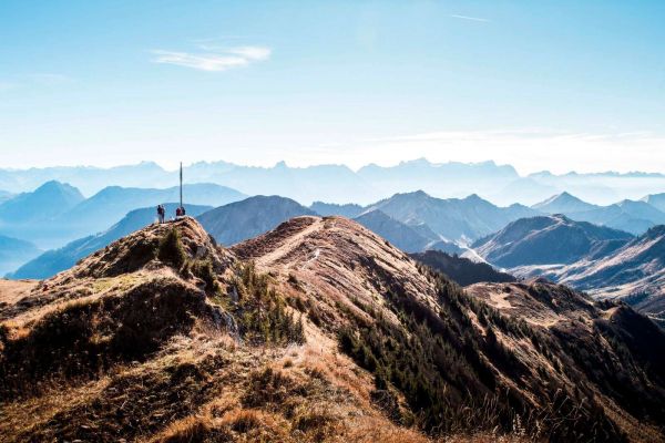 Crêtes de montagne douces en teintes chaudes d'automne s'étendent sous un ciel bleu clair. Les randonneurs se tiennent au sommet, entourés de lumière du soleil et du silence de la nature.