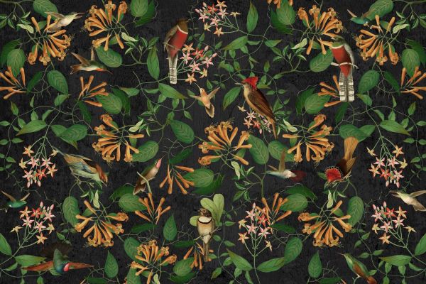 Une riche composition de colibris tropicaux et de fleurs colorées sur un fond profond et sombre. Le feuillage vert et les accents dorés des fleurs créent un contraste élégant et exotique, parfait pour ajouter une touche de luxe à n'importe quel espace.