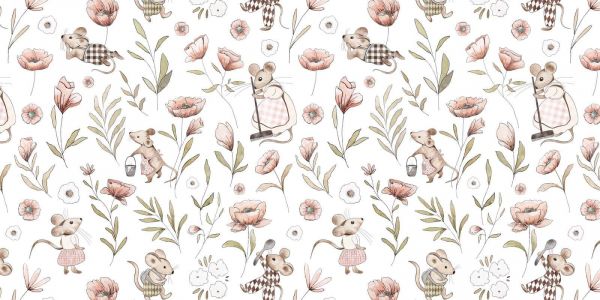 Un motif ludique avec des souris joyeuses au milieu de fleurs et de feuilles, sur un fond blanc. Les douces couleurs pastel et les adorables illustrations créent une atmosphère charmante et vivante, parfaite pour ajouter une touche mignonne et joyeuse à n'importe quelle pièce.