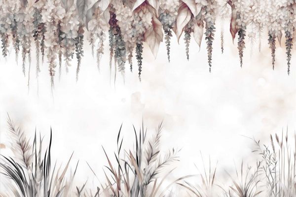 Ce design raffiné apporte la paix et la beauté de la nature dans une harmonie de délicates fleurs de glycine et d'herbes sauvages doucement ondulantes. Les grappes de fleurs, peintes dans des teintes délicates de crème, sépia et violet-gris, pendent légèrement vers le bas et se fondent harmonieusement dans l'arrière-plan léger et brumeux. Les feuilles et les types d'herbes sont exécutés dans des tons terre neutres, ce qui crée un ensemble équilibré et naturel.