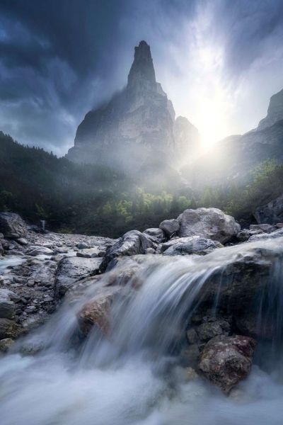 Un design dramatique et mystique dans lequel un puissant torrent de montagne se fraye un chemin à travers un paysage sauvage. Le sommet imposant de la montagne disparaît en partie dans la brume, tandis que les premiers rayons de soleil percent et donnent à la scène une allure rêveuse, presque mythique.