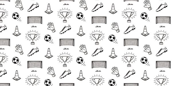 Papier peint avec un motif noir et blanc d'illustrations de chaussures de football, de buts, de ballons de football et de bonnets.