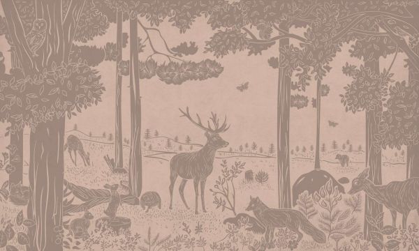 Un paysage forestier paisible avec des animaux détaillés comme des cerfs, des renards et des oiseaux. Les couleurs en arrière-plan créent une atmosphère paisible et naturelle, parfaite pour un environnement serein.