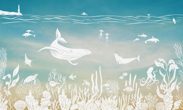 Un paysage sous-marin serein avec des baleines, des raies et d'autres animaux marins dans des teintes douces. Le design capture le calme de l'océan avec des détails minimalistes, des coraux subtils et des ombres qui créent une atmosphère raffinée.