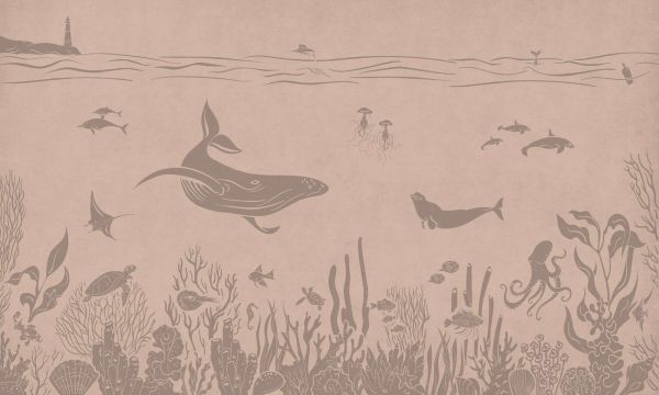 Un paysage sous-marin serein avec des baleines, des raies et d'autres animaux marins dans des teintes douces. Le design capture le calme de l'océan avec des détails minimalistes, des coraux subtils et des ombres qui créent une atmosphère raffinée.