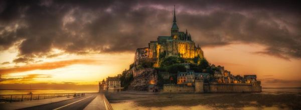 Le Mont Saint Michel sur papier peint. Une île rocheuse, située en Normandie, France. Le Mont Saint Michel est classé au patrimoine mondial de l'humanité. Un ciel magnifiquement éclairé avec une abbaye médiévale illuminée
