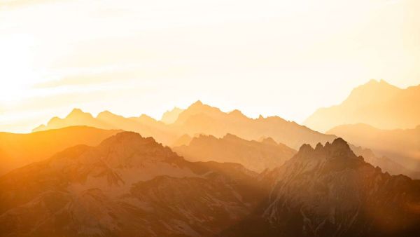 Les sommets de montagnes doucement inclinés baignés dans une lueur dorée chaleureuse. Le lever du soleil éclaire les silhouettes en couches, créant une atmosphère rêveuse, presque éthérée.