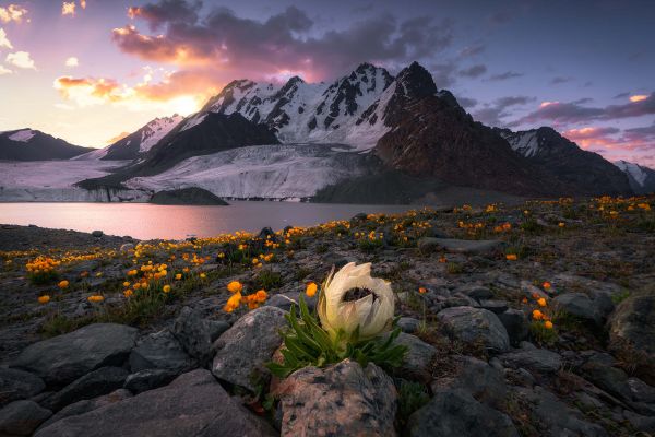 Matin à Saussurea sur Papier peint photo. Une montagne enneigée près d'un lac avec des fleurs et un beau ciel.