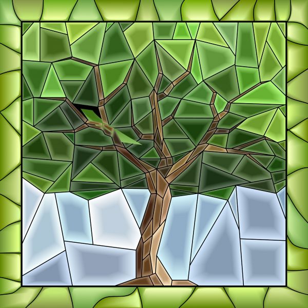 Mosaïque d'un arbre sur Papier peint photo. La bordure verte autour de l'arbre crée plus de profondeur dans la pièce.