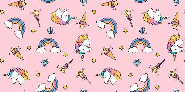 Papier peint avec un motif de licornes colorées, d'arcs-en-ciel et de glaces sur fond rose.