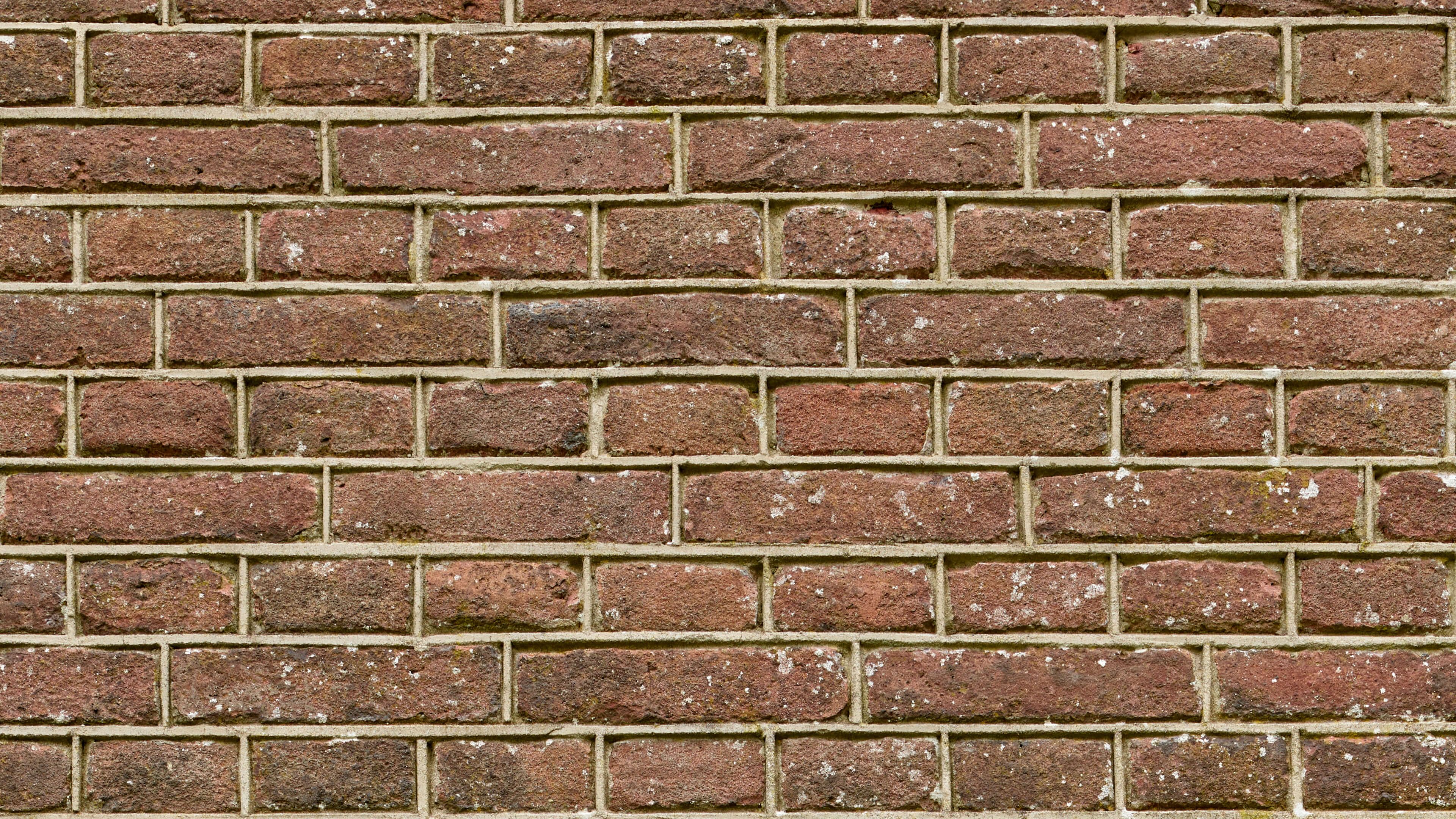 Mur de vieilles briques avec un jointoiement propre. Le bas du mur est coloré en vert par la mousse.