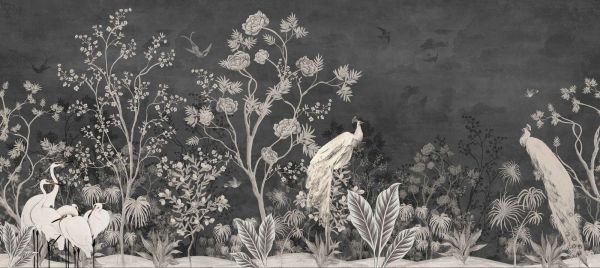 Cette représentation artistique d'oiseaux blancs et de flore exotique sur fond sombre exhale la tranquillité et le mystère. Idéale pour un décor moderne à la recherche d'une touche d'élégance naturelle.