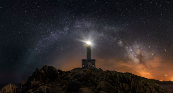 Un phare sur une montagne de rochers avec un ciel étoilé.