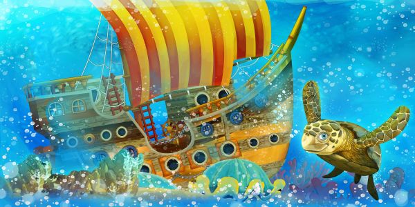 Monde sous-marin avec un bateau pirate coulé dans le récif corallien avec une tortue.