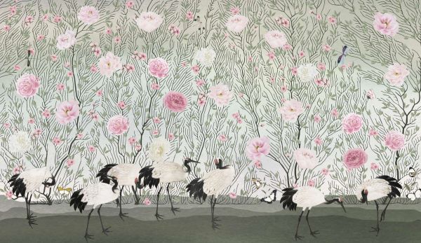 Une scène gracieuse avec des grues majestueuses entourées de roses et de fleurs délicates. Les nuances subtiles de rose et de vert créent une atmosphère sereine et raffinée, rehaussée par les détails gracieux des fleurs et des feuilles. Les papillons et les libellules ajoutent une touche d'élégance au design.