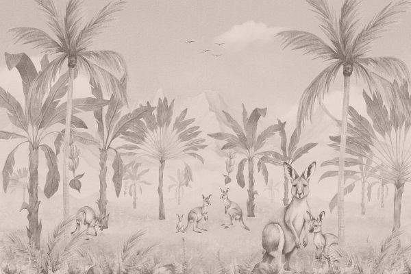 Une représentation subtile de kangourous appréciant l’ombre sous une collection de palmiers tentaculaires, le tout dans une gamme de gris doux qui suggère la paix et l’unité avec la nature.
