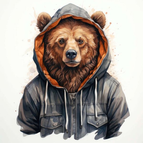 Ce design unique montre un ours brun vêtu d'un sweat à capuche moderne, un mélange intrigant de nature et de flair urbaine. Les teintes chaudes et naturelles de l'ours contrastent magnifiquement avec le gris froid du sweat à capuche et les accents orange vifs à l'intérieur. Les coups de pinceau doux donnent à l'ensemble un aspect pictural, tandis que les éclaboussures subtiles en arrière-plan créent une sensation dynamique et artistique.