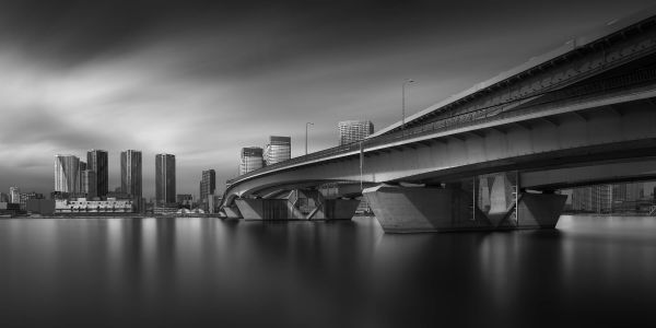 Une ligne d'horizon avec de grands immeubles de bureaux en noir et blanc. Sur la droite se trouve un pont qui montre le chemin vers la ville.