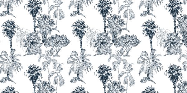 Papier peint de palmiers et d'arbres tropicaux bleu canard. Créez plus d'atmosphère dans le salon avec ce papier peint.