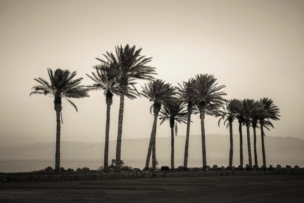 Palmiers en noir et blanc. On peut voir les montagnes à l'arrière-plan.