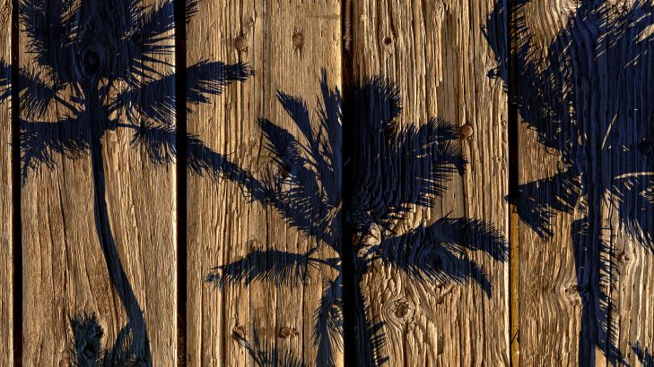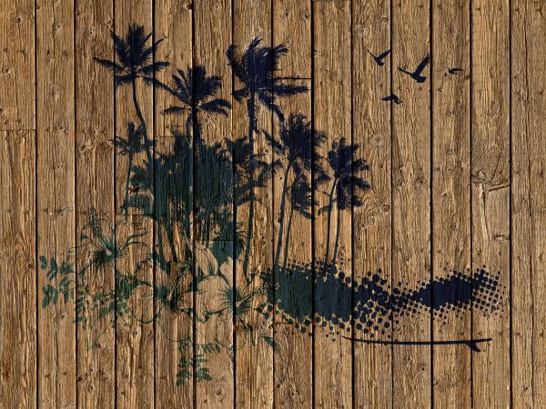 Image estivale avec des palmiers, la mer, des fleurs, des oiseaux et une planche de surf sur du bois. Ce papier peint crée une atmosphère unique dans votre maison.