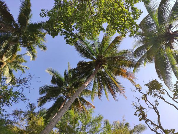 Palmiers tropicaux avec noix de coco vus d'en bas