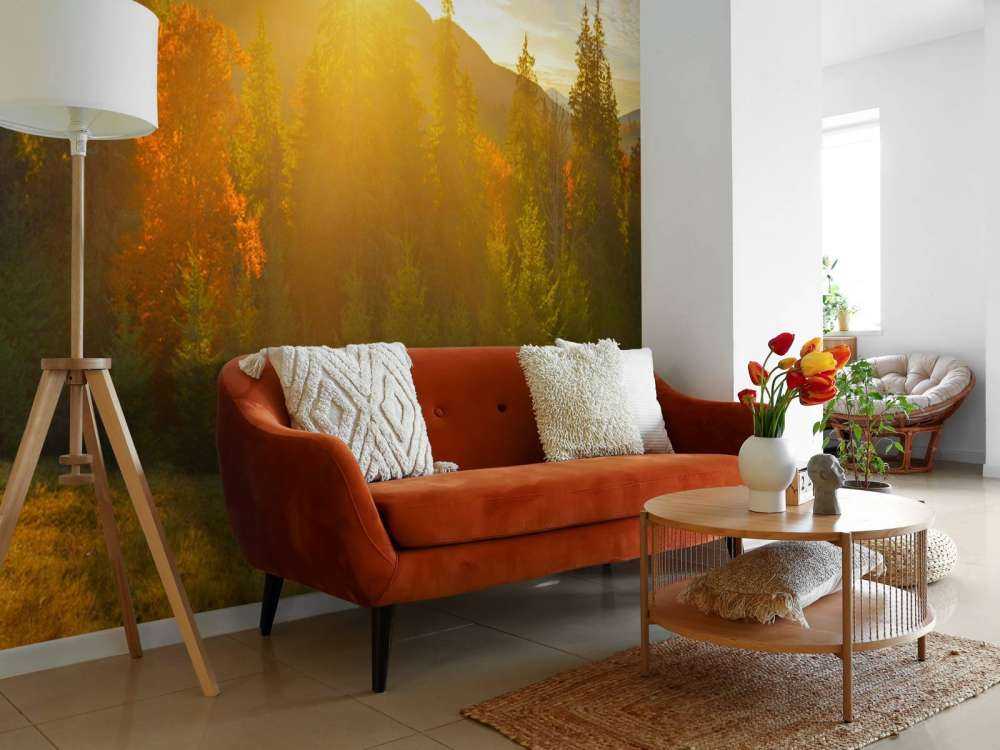 Papier peint avec une photo panoramique d'une pinède où le soleil brille juste derrière les montagnes, et cela donne une belle couleur sur la photo.
