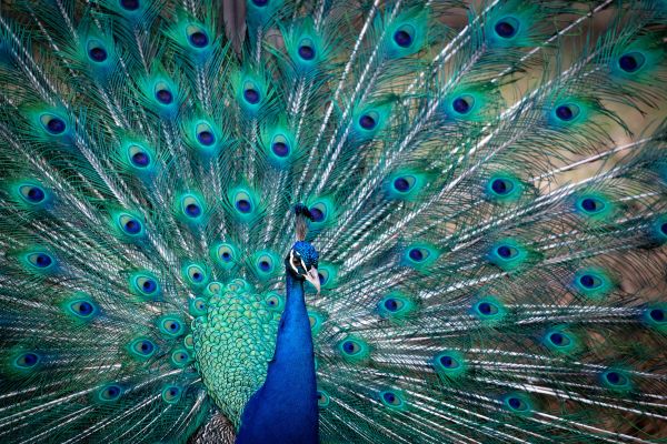 Papier peint d'un paon bleu avec une queue en plumes étalées. Les couleurs ajoutent plus d'atmosphère à votre maison.