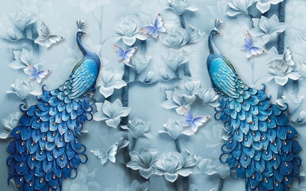 Papier peint de deux paons bleus avec des papillons en arrière-plan.