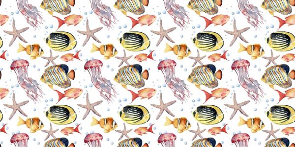 Une célébration de la vie marine en aquarelle, cette image déborde de couleur et de mouvement. Des méduses majestueuses aux étoiles de mer élégantes, chaque élément est peint avec soin pour former une tapisserie vivante de l'océan.