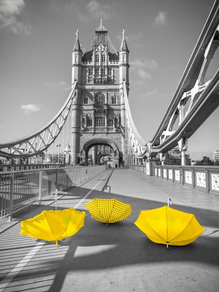 Parapluies jaunes sur le Tower bridge en différents matériaux