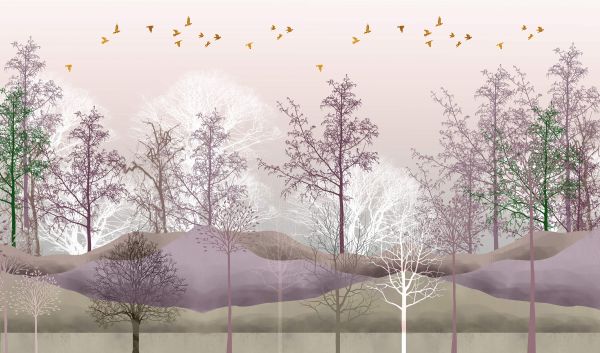 Paysage avec des arbres et des oiseaux colorés. Transformez votre mur en un véritable accroche-regard avec ce papier peint.