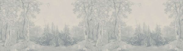 Vous voyez un paysage forestier serein avec des bouleaux et des pins, enveloppé de douces teintes de bleu et de blanc. Le design dégage une sensation de calme et de fraîcheur, comme si vous étiez transporté dans une oasis tranquille au cœur de la nature.