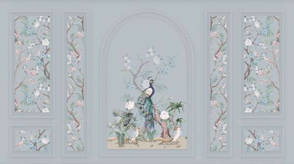Une scène enchanteresse d'un beau paon entouré des fleurs et du feuillage délicats d'un jardin paisible. La palette de couleurs subtiles souligne le calme et la sérénité qui se dégagent de ce motif.