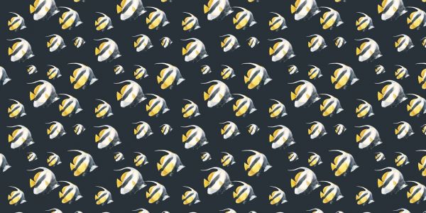 Comme des joyaux contre un ciel nocturne, des poissons tropicaux avec des teintes dorées et blanches brillent sur ce tissu sombre. La répétition du motif suggère un océan infini plein de découvertes, chaque spécimen un silhouette unique contre la profondeur silencieuse.