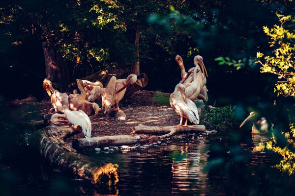 Papier peint d'un groupe de pélicans dans un zoo. Combinez-les dans votre maison pour plus d'ambiance.