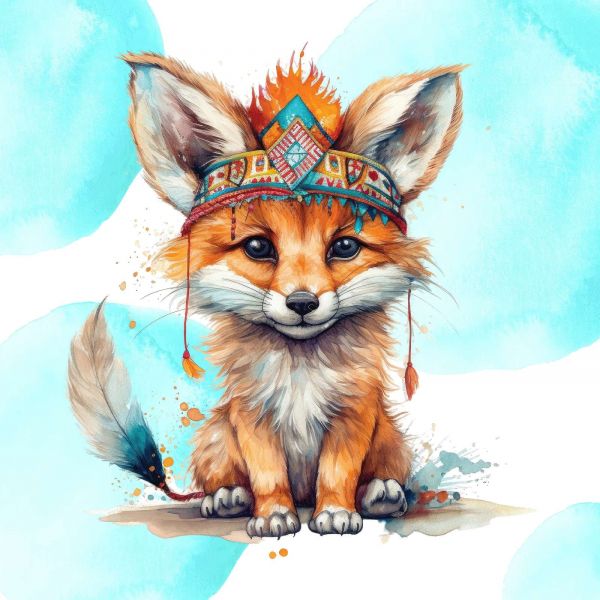 Magnifique tapisserie où un bébé renard coiffé d'une couronne de plumes