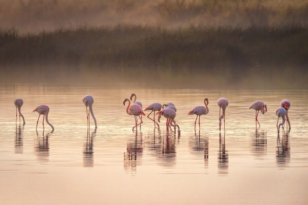 Flamants dans un lac. Au-dessus du lac, il y a encore un peu de brouillard.