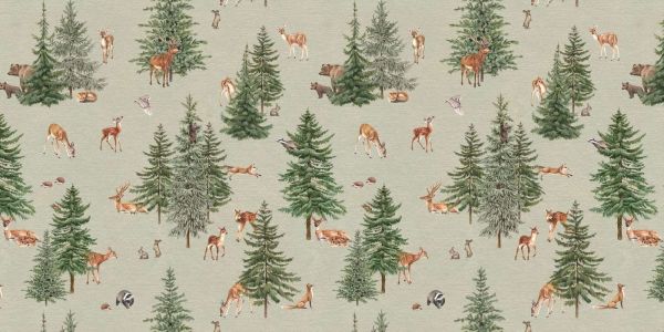 Un motif forestier atmosphérique avec des cerfs, des renards, des ours et d'autres animaux de la forêt, entouré de majestueux pins. La douce couleur de fond et les illustrations détaillées donnent vie à la tranquillité d'une forêt de pins, idéale pour créer une ambiance naturelle et chaleureuse dans chaque espace.