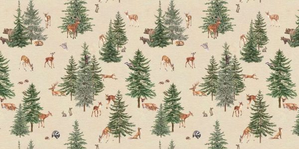 Un motif forestier atmosphérique avec des cerfs, des renards, des ours et d'autres animaux de la forêt, entouré de majestueux pins. La douce couleur de fond et les illustrations détaillées donnent vie à la tranquillité d'une forêt de pins, idéale pour créer une ambiance naturelle et chaleureuse dans chaque espace.