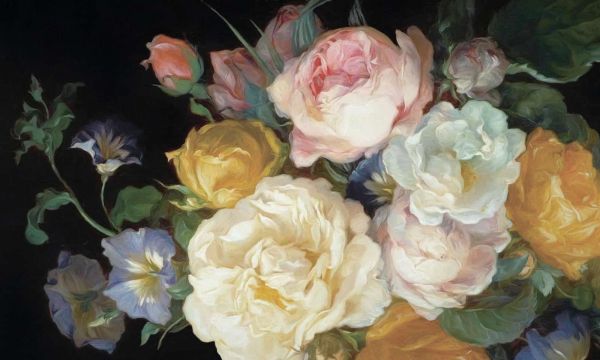 Un design chaud et accueillant avec un mélange de roses jaunes et crème et des accents bleus. Le fond sombre renforce les couleurs vives et donne à l'ensemble une allure dramatique et classique. Parfait pour une ambiance intemporelle et chaleureuse.