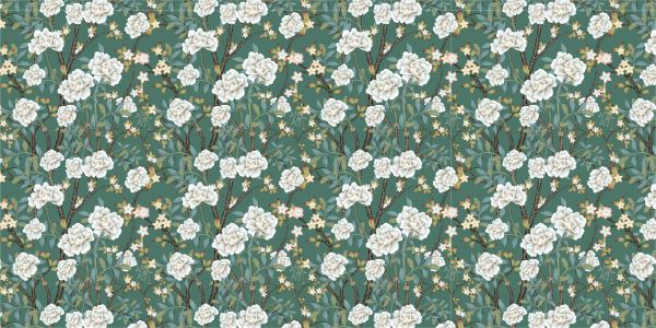 Une riche tapisserie de roses de jardin s'épanouit sur un fond vert paisible, avec des nuances allant du jade profond aux verts pastel doux. Les branches plus foncées offrent un fort contraste, mettant encore plus en valeur les pétales d'un blanc pur.