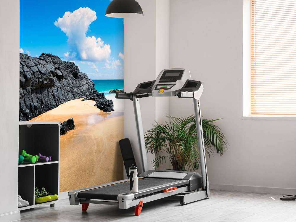 Wandkleed van een leeg strand met grote rotsen in Hawaii