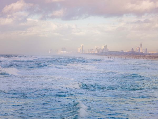 Plage de Bat Yam en Israël. Au loin, on aperçoit une tempête sur la mer.