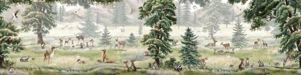Cette scène impressionnante donne vie à un monde forestier vivant, sur fond d'un paysage montagneux brumeux. Dans le champ ouvert couvert d'herbe, entouré de pins et d'arbres feuillus, des cerfs se déplacent gracieusement, des lapins et des hérissons se cachent parmi les champignons, tandis que des blaireaux, des renards et des écureuils se mêlent avec malice à ce tableau naturel. Dans le ciel, des hiboux et des oiseaux chanteurs volent, et même des ours sont visibles au loin. L'utilisation des couleurs se compose de tons naturels: verts doux, nuances brunes et grises, et des reflets clairs qui donnent à la forêt une allure calme mais riche. Le style de dessin réaliste, avec des coups de pinceau subtils et une profondeur en couches, confère à l'image une qualité picturale sans être écrasante. Cette conception s'intègre magnifiquement dans un intérieur classique de style rural ou rustique, où des matériaux naturels tels que le bois, le lin et la laine dominent. Pensez à une chambre d'enfant avec un lit en bois, des couvertures tricotées et des accents neutres chaleureux, ou à un coin lecture douillet avec des fauteuils en cuir, une couverture en laine et un éclairage d'atmosphère doux. Cette scène se prête parfaitement à des espaces où le calme et le lien avec la nature sont souhaités: chambres d'enfants, chambres à coucher, coins de jeu, voire un espace calme à la maison comme un bureau à domicile ou une bibliothèque. Grâce à sa composition panoramique et à son sentiment d'ouverture, elle crée un effet spatial et détendu. La présence de nombreux animaux différents et de couches paysagères invite à la découverte, rendant ce design non seulement apaisant mais aussi captivant à chaque regard. Un équilibre parfait entre immersion dans la nature, raffinement et chaleur — idéal pour les jeunes et les moins jeunes.