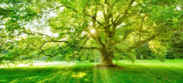 Le soleil brille à travers les feuilles vertes de ce platane géant.