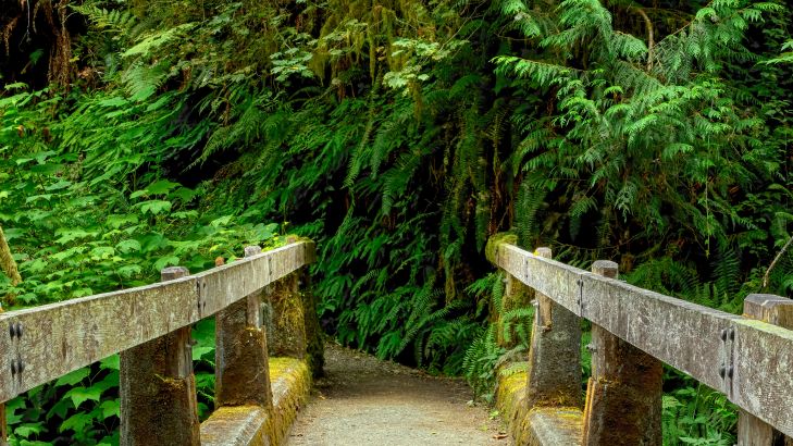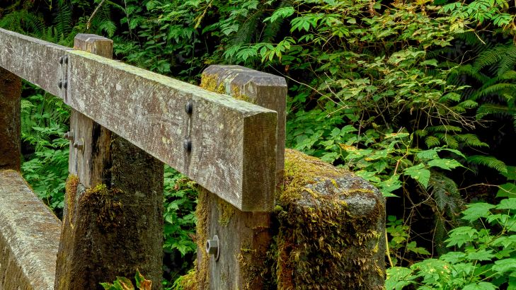 Pont de bois et de béton à travers une forêt sauvage verdoyante