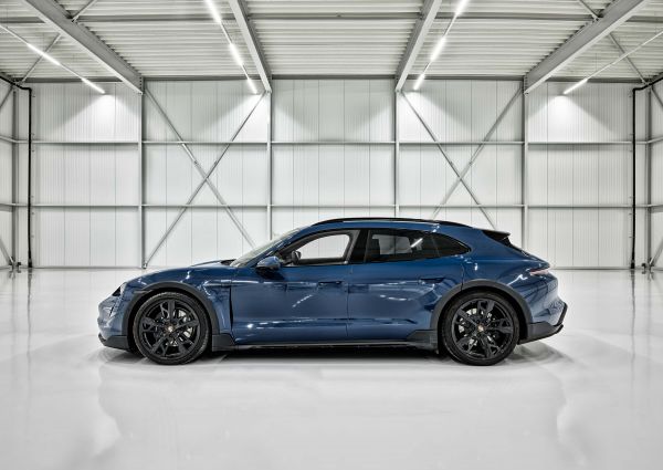 Superbe photo du modèle Porsche Taycan Turbo S dans un hall industriel.