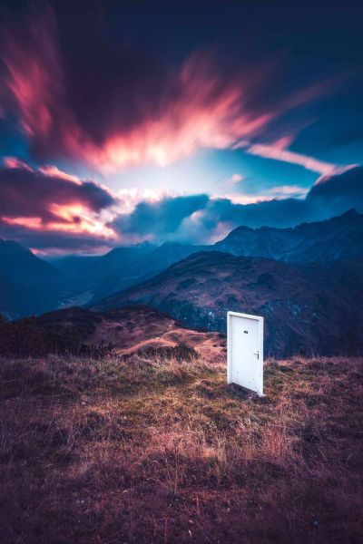 Un paysage montagneux surréaliste au coucher du soleil avec une porte blanche solitaire au milieu de la nature. Le jeu de couleurs violet, bleu et rose souligne l'atmosphère mystérieuse, presque magique de la scène.