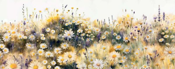 Un champ atmosphérique rempli de marguerites en fleurs et de lavande violette, baignant dans une chaude lueur de lumière du soleil. Les douces touches de pinceau donnent à l'ensemble une apparence rêveuse et aquarelle. La combinaison de blanc, jaune et lilas crée une sensation apaisante et romantique, parfaite pour une ambiance légère et naturelle.